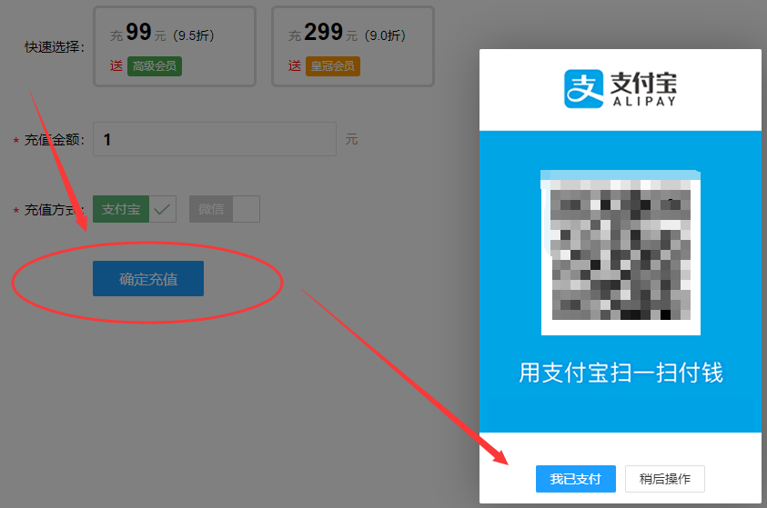 充值步骤四:点击【确定充值】按钮。弹出支付二维码后,扫码支付成功即可充值成功。