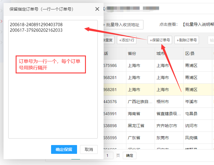 保留订单号:点击【+保留订单号】按钮,弹出填写订单号的对话框,输入要保留的订单号,点击【确定保留】按钮。那么我们填写上去的订单号就会被保留下来。没有填写上去的订单号,就会被删除掉。