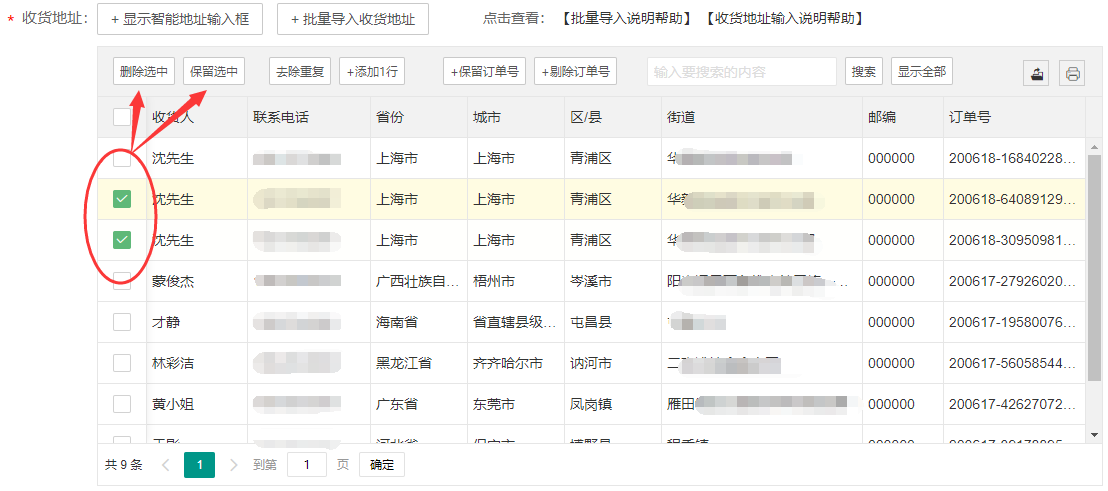 方法1:选中要筛选的订单,然后点击【删除选中】或【保留选中】