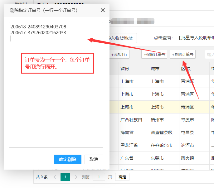 剔除订单号:点击【+剔除订单号】按钮,弹出填写订单号的对话框,输入要剔除的订单号,点击【确定剔除】按钮。那么我们填写上去的订单号就会被剔除掉。没有填写上去的订单号,就会被保留下来。
